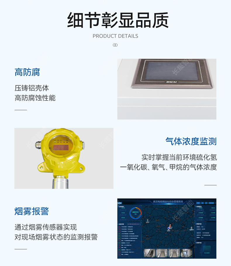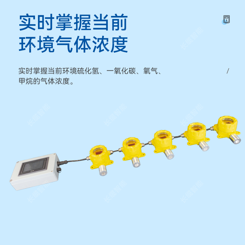 环境监测子系统安装在电缆隧道内电缆接头或井口等位置,用于对电缆隧道内的环境参数进行监测,包含氧气、一氧化碳、硫化氢、可燃气体、环境温湿度值的监测及烟雾报警功能。