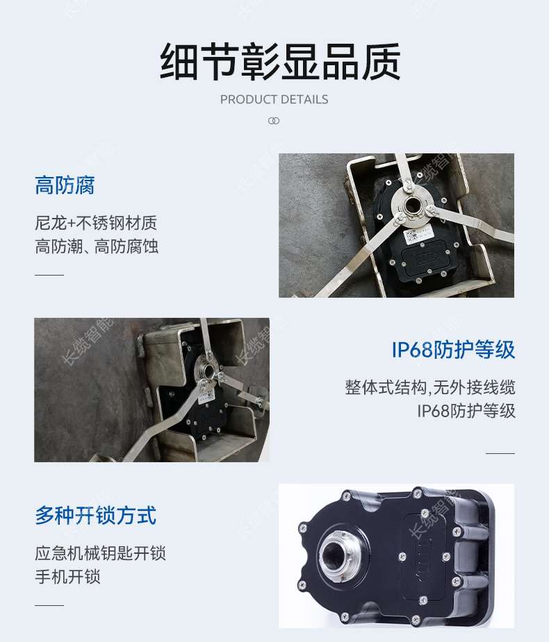 1. 锁体外壳采用尼龙加玻纤混合材料,锁栓、连杆采用304不锈钢材料,具有极高的防潮、防腐蚀能力;
