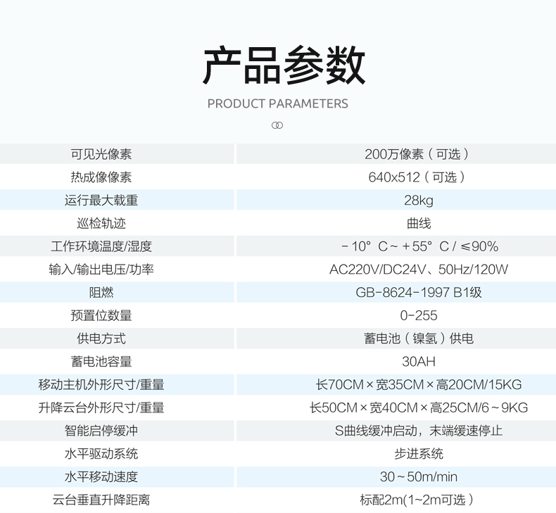 隧道智能巡检机器人主要由控制中心、水平运动结构、轨道总成、升降运动机构以及视、音频设备等五大部分组成,所搭载的各类摄像机、拾音器设备在采集了相应的数据后,通过系统的数据传输通道(有线、无线、载波等方式),将网络数字信号或模拟信号传输给监控中心的控制平台。实现对于电缆隧道的全面监测。