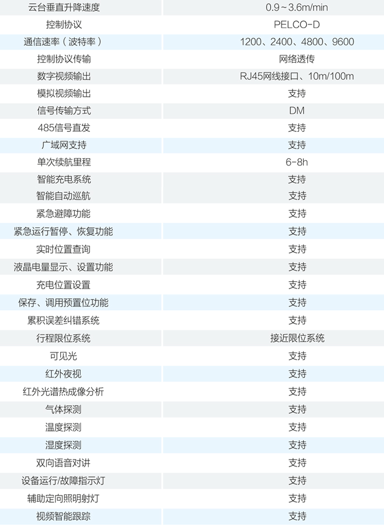 Ø 自主充电:机器人自带电池电量检查电路且可人工设置电量报警下限,电量过低时会自动停止当前巡检任务,同时发出警报,之后自行前往充电站充电。