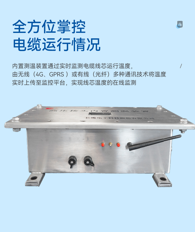测温装置通过实时监测电缆线芯运行温度,由无线(4G、GPRS)或有线(光纤)多种通讯技术将温度实时上传至监控平台,实现线芯温度的在线监测。