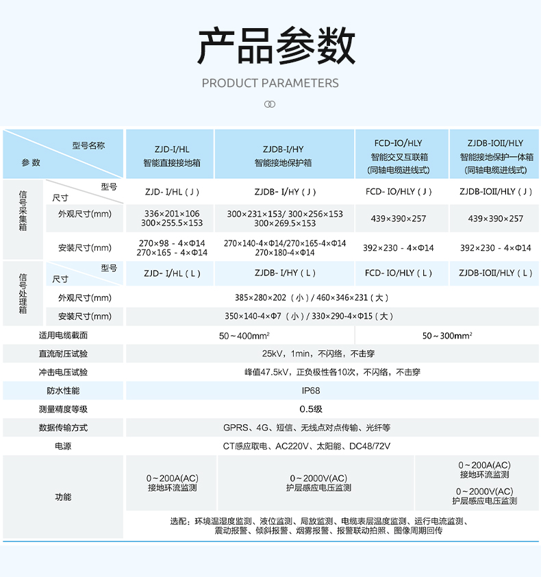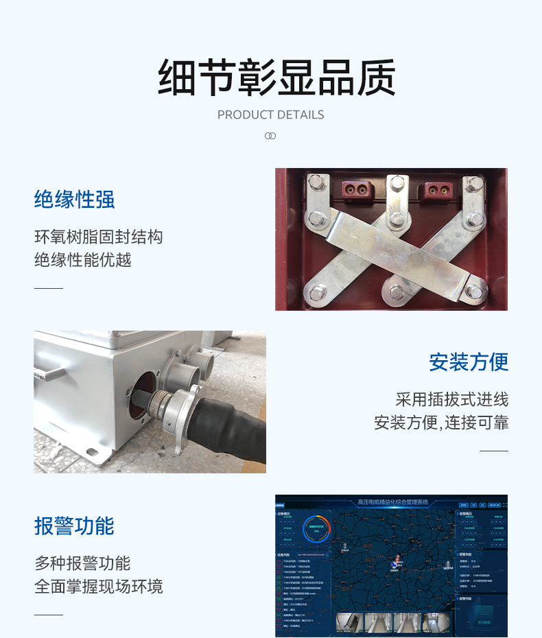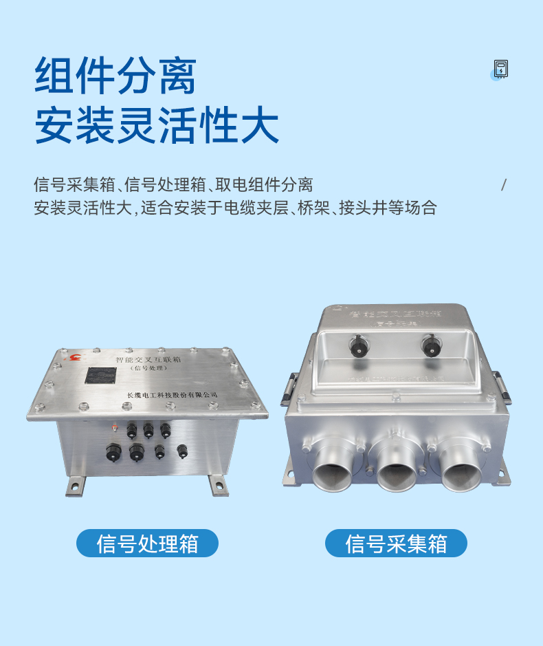 Ø小巧精致,信号采集箱(传统接地组件)、信号处理箱、取电组件分离,安装灵活性大,适合安装于电缆夹层、桥架、接头井等场合。
